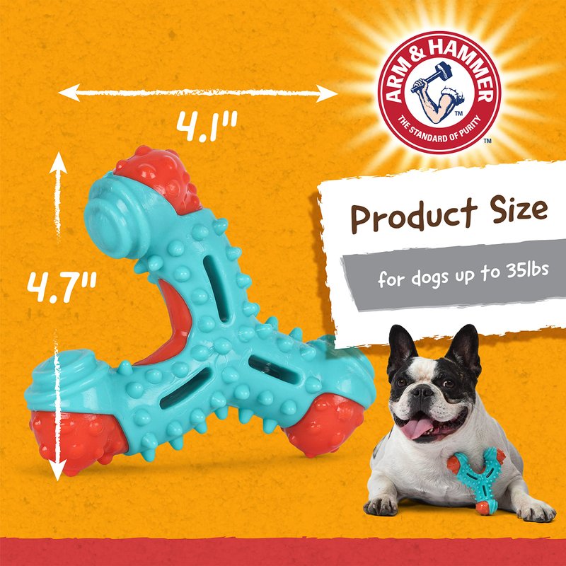 - ARM & HAMMER BAKING SODA - This dog toy is infused with the signature Arm & Hammer baking soda ingredient to naturally deodorize bad dog breath