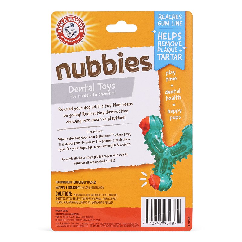 - DOG CHEW TOY FOR MODERATE CHEWERS - The Arm & Hammer baking soda Nubbies dental dog toy is a durable dog toy for light to moderate chewers