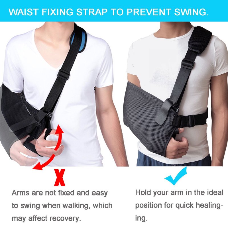 - MORE BALANCED AND STABLE - Adjustable straps on arm slings make them adaptable to individual needs. The waist strap prevents your injury arm from swinging when you walk, perfect for those with an active lifestyle and requires wearing an arm sling for long periods of time.