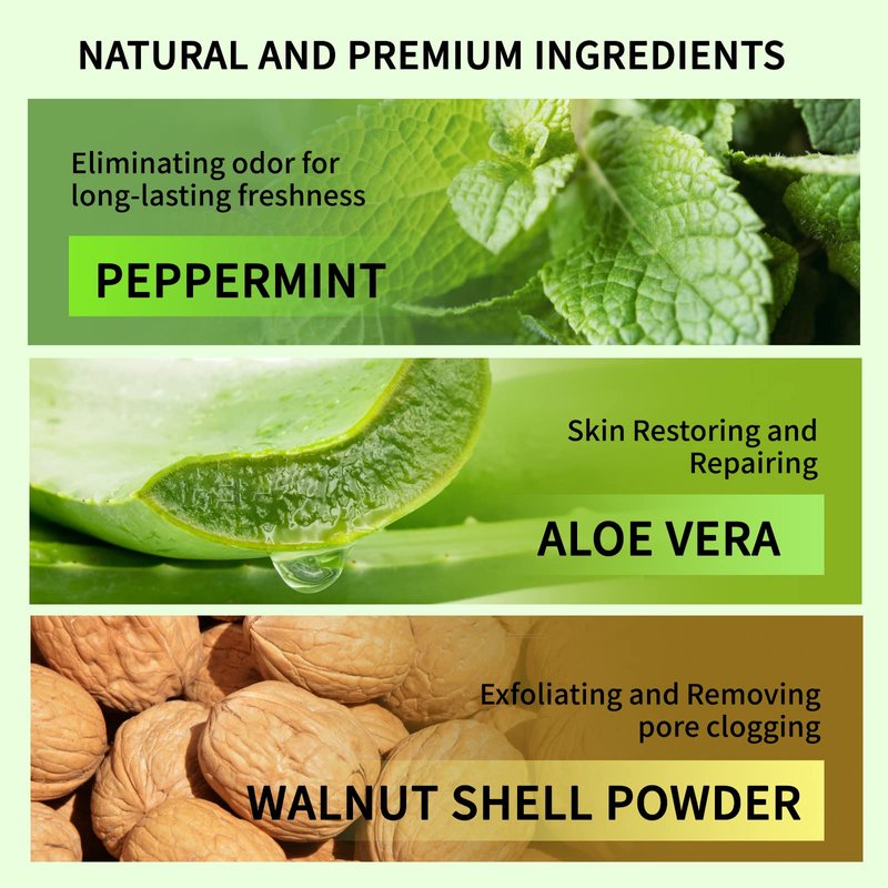 - 【100% NATURAL INGREDIENTS】The scrub combines high-quality peppermint extract, aloe vera and walnut shell powder to scrub, clean and nourish the skin while effectively repairing it without any harmful chemicals. Formulated with Hypoallergenic, GMO Free, Sulfate Free, Aluminum Free, Phthalates Free, Cruelty Free and Mineral Oil Free