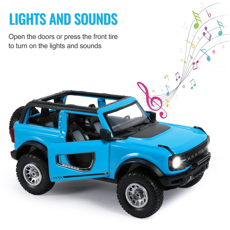 - PLAY OR DISPLAY: This collectible bronco toy car has special lighting and sound effects that all kids will love. It provides sound effects and dazzling lights for a fun experience. Or you can use it as a model car display.