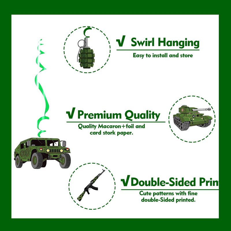 - ♥【Easy to hang】You can hang them from the ceiling, chandeliers, and any place you want to decorate, these decorations filled with military atmosphere will make your party very eye-catching.