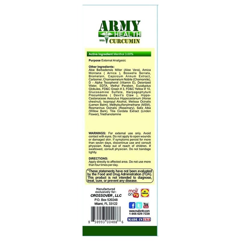 Army Health Roll On in a double pack has a natural formula with curcumin extract that supports the affected area. Its natural components such as curcumin have properties that support discomfort. Army Health Roll On is a unique formula combining quality herbs and extracts; Arnica, Aloe Vera, Bromelain, Vitamin E, Eucalyptos, Glucosamine, Chamomile, Lemon Balm. They are extracted under the most rigorous processes and standards to have the highest concentration, quality and purity. It provides relief, hydration and heat . Its natural components presented in its purest and most concentrated version are extracted under the most rigorous processes and standards to have the highest concentration, quality and purity; Turmeric, Menthol, Eucalyptus oil, Arnica extract, Aloe Vera, among others. Army Health in roll on is for a practical application. Apply directly on the affected área (external use only) Do not use more than 4 times a day. Avoid contact with eyes and do not apply to wounds or damaged skin. For over 20 years, our company By Cariola has been reviewing and developing new formulations for the products, guaranteeing innovation and ensuring máximum efficacy in everything we do. We believe the answer to a healthier and happier life is to use all of nature’s power. We are a leading company with the same commitment as always: to bring wellness to the community. Ingredients: Aqua, Sodium Polyacrylate, Cetyl Alcohol, Glycol Stearate, Glyceryl Stearate, Caprylic/Capric Triglycerides, Menthol, Eucalyptus Oil (Globulus), Mineral Oil, Rosemary Oil, Arnica Extract, Aloe Vera Extract, Curcumin (Turmeric oleoresin), Glucosamine Sulfate, Wintergreen Oil, Chamomile Extract, Aesculus Hippocastanum L. extract (Horse Chestnut Extract), MSM (Methylsulfonylmethane), Tocopherol (Vitamin E), Methylchloroiso.