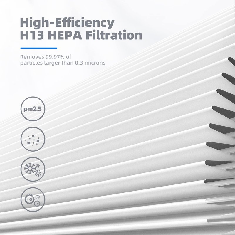 - 99.97% High-Efficiency Filtration: H13 True HEPA filter layer is used, which meets the high-Efficiency Particulate Air (HEPA) standard. It can filter 99.97% of airborne particles larger than 0.3 microns.