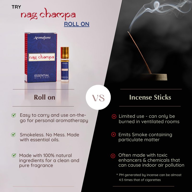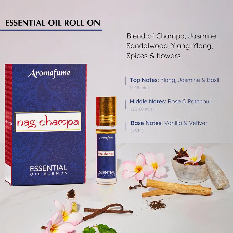 - CONTENTS: 3 X 6ml Bottles of Aromafume Nag Champa Essential Oil Roll On Blend which is a carefully prepared with a blend of Sandalwood, Geranium, Ylang Ylang & Jasmine and has fantastic lasting strength and sillage! This essential oil spreads tranquility and gives you a sensation of compassion, inner peace and overall wellness!