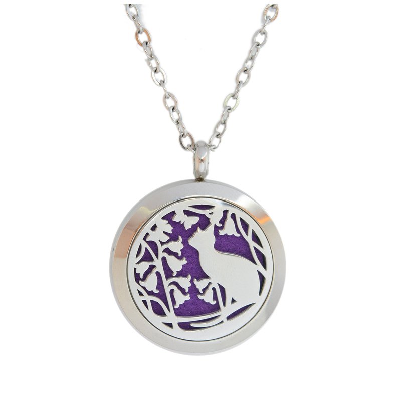 Aromatherapy Essential Oil Diffuser Stainless Steel 30MM Silver Magnetic Locket Pendant with Chain Necklace and Colored Refill Pads & Diffuser Bracelet All in a Velvet Bag (Cat)