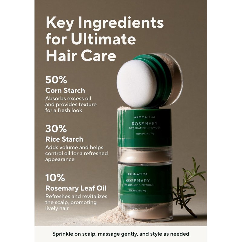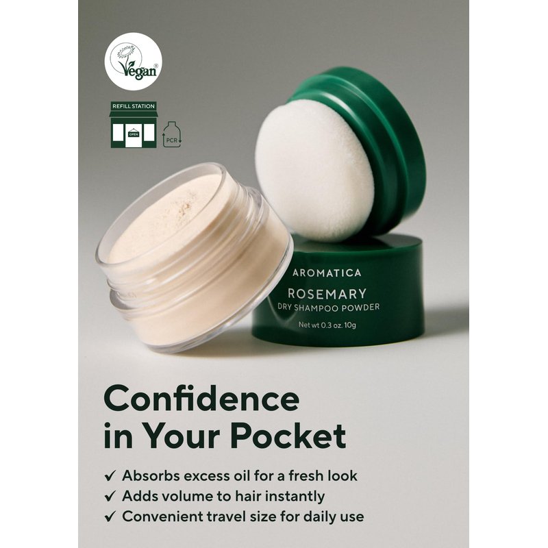 AROMATICA Rosemary Dry Shampoo Powder 10g/0.3oz - Mini Dry Shampoo with Panthenol and Biotin For Dark Hair | Travel Dry Shampoo | Non aerosol & Talc Free