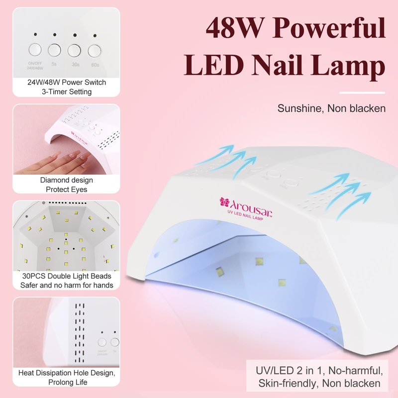 - 3 Timers Setting Optional - Arousar diamond nail lamp is available in 3 timers (5s, 30s, 60s) to meet the baking time needs of different gel nail polish. With 3 timer options, you have complete control over the curing process, ensuring perfect nails every time.