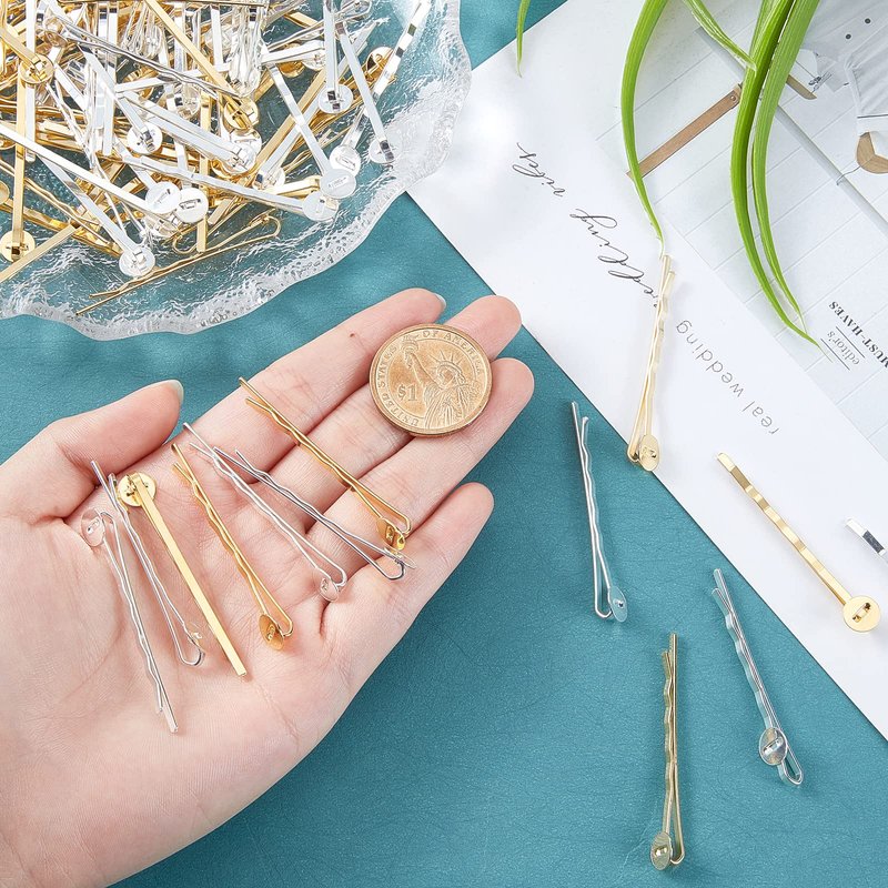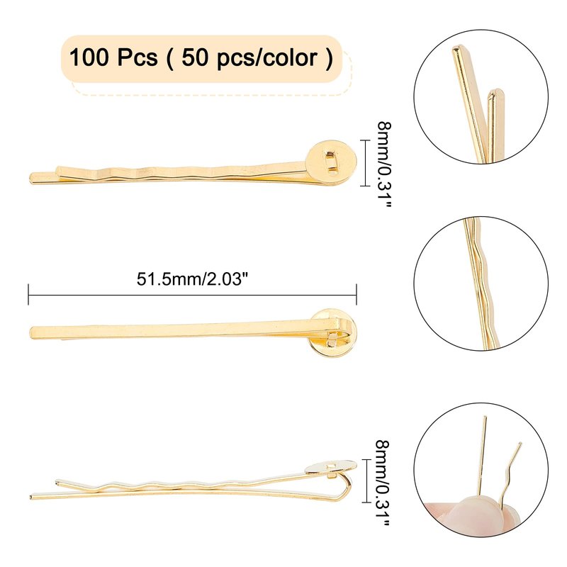 Product description Specification: Brand: arricraft We are a store specializing in providing all kinds of handmade accessories. Our aim is to provide most abundant and cost-effective accessories for our customer. If you have unlimited passion and creativity for life and craft, we will be your trusted partner. Material: iron Color: silver and golden Size: Iron Hair Bobby Pin Findings: about 2.03 inch(51.5mm) long, 0.31 inch(8mm) wide, tray: 0.31 inch(8mm,), 2 colors, 50pcs/color, 100pcs. Note: the picture shown is a representation of the item, you'll receive from the actual size items. Please double check the sizes before purchasing.