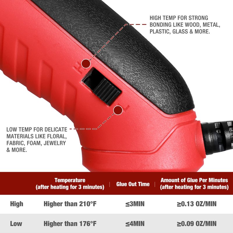 - Dual Temp Control: This mini glue gun has high and low temp settings, the high temperature is ideal for projects utilizing heavy-duty materials that require maximum bonding capacity. If you're working on a project that requires elegant skill and a gentle glue gun, the low temp mode is perfect for fragile crafts that require the glue stick to melt at a lower temperature to protect delicate craft materials.