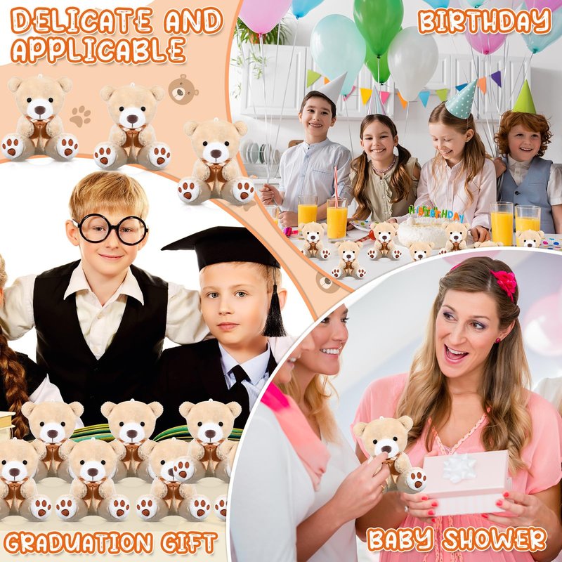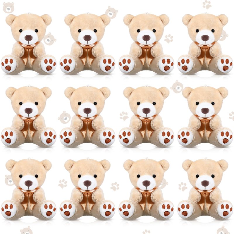 Features: Create a romantic atmosphere: You can hang the small bear bulk on the door, window, shelf and so on, enhance the warmth of your home and add romance to surprise your wife, girlfriend or daughter, create a impressive memory. Nice gifts and party favors: The tiny bears with footprint are suitable for giving to family members, classmates, teammates, boys and girls on Easter, graduation, baby showers, birthdays as mementos. You also can put the 4 inch mini bear plush toy on the cake and table for bear themed baby shower, bear themed party or birthday for boys and girls, nice party favors choice. Specifications: Material: polyester and plushSize: approx. 4 inches/ 11 cm tallPackage includes: 12 x Stuffed animals tiny bearNotes: Manual measurement, please allow slight errors on size. The color may exist a slight difference due to different screen displays. Little ones and pets should use our product under the supervision of adults.