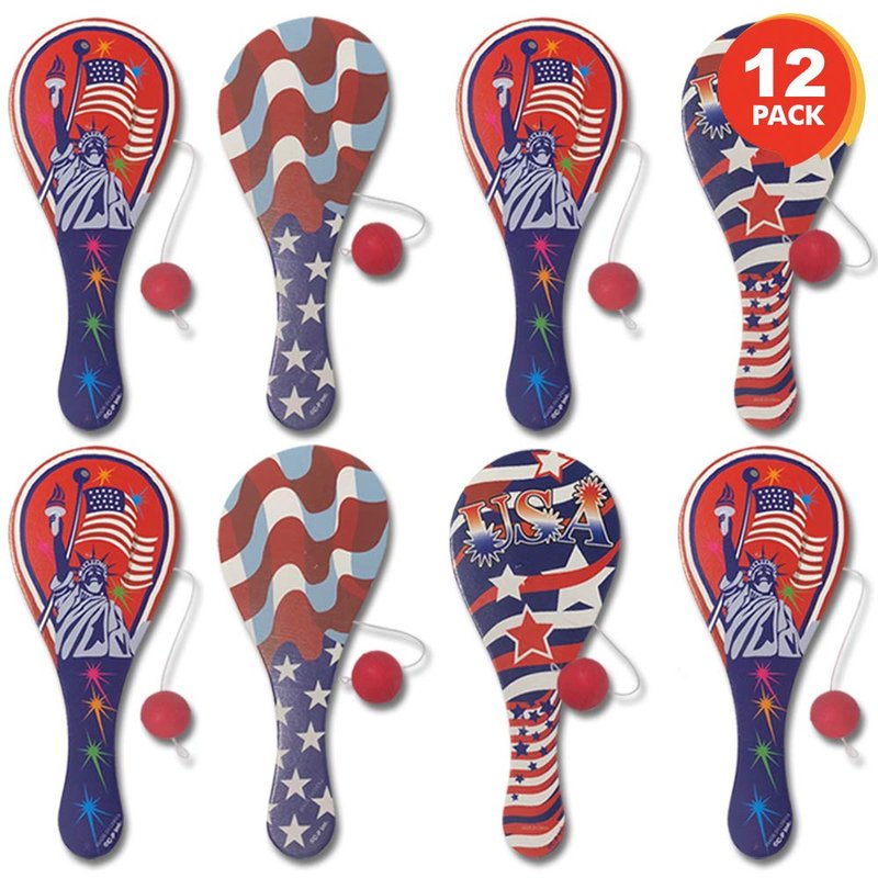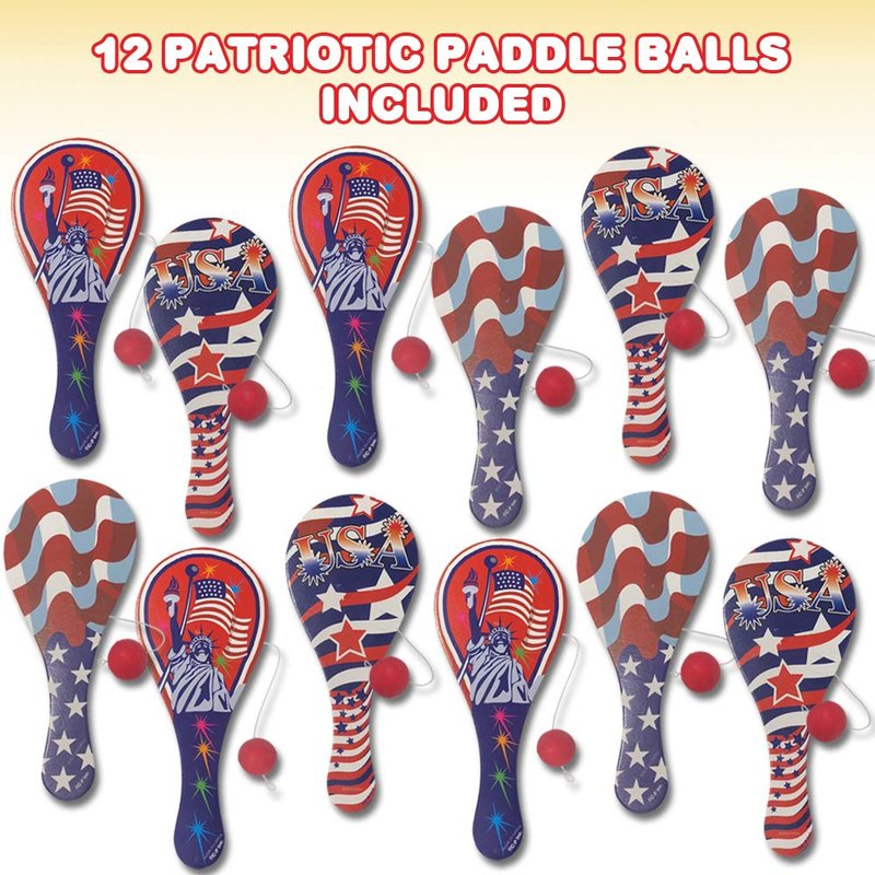 - FUN PATRIOTIC COMPETITION: Classic paddle ball toys with patriotic designs! This pack comes with 12 paddle balls to fuel hours of active fun during July 4th backyard BBQs, patriotic-themed parties and everything in between.