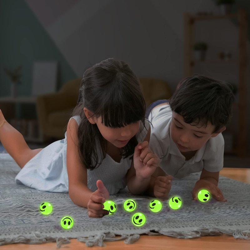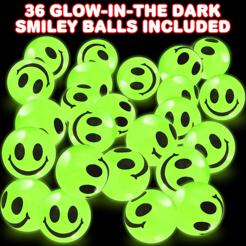 - HIGH BOUNCE; COOL GLOW: Bouncy balls with a delightful smiley face and the coolest glow! These 1” glow in the dark bouncing balls will have kids thrilled. Leave them under light to activate the glow, give them a good bounce, and watch them light up the room in striking style.