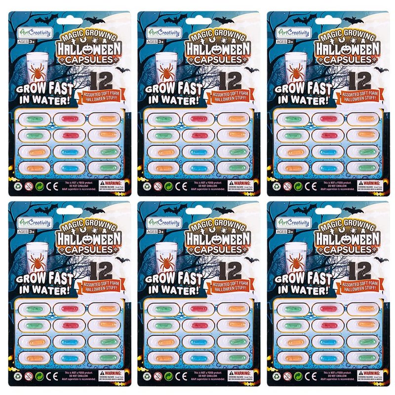 - WATCH THEM GROW: Have the little ones happily wonder-struck with these magical growing toys! Just drop a foam capsule in water and watch it evolve into a Halloween treat. Every set comes with 6 packs with 12 capsules each. This means more fun and encourages your kiddo to share the magic.