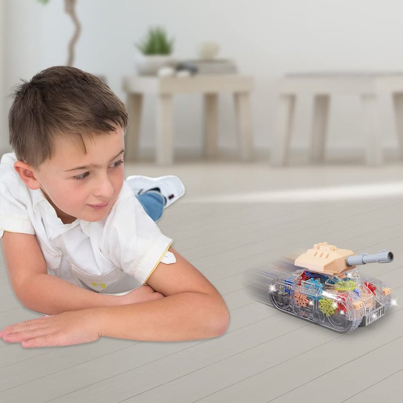 - FUEL THE EXCITEMENT: A toy tank that takes fun to eye-catching extremes! This pack comes with 1 transparent gear tank that features a rotating turret, music, flashing lights, bump n’ go mechanism, and colorful gears that turn in spectacular style as it moves around. Measures 6” x 4.25” and includes 3 X AA batteries to power the musical toy tank.