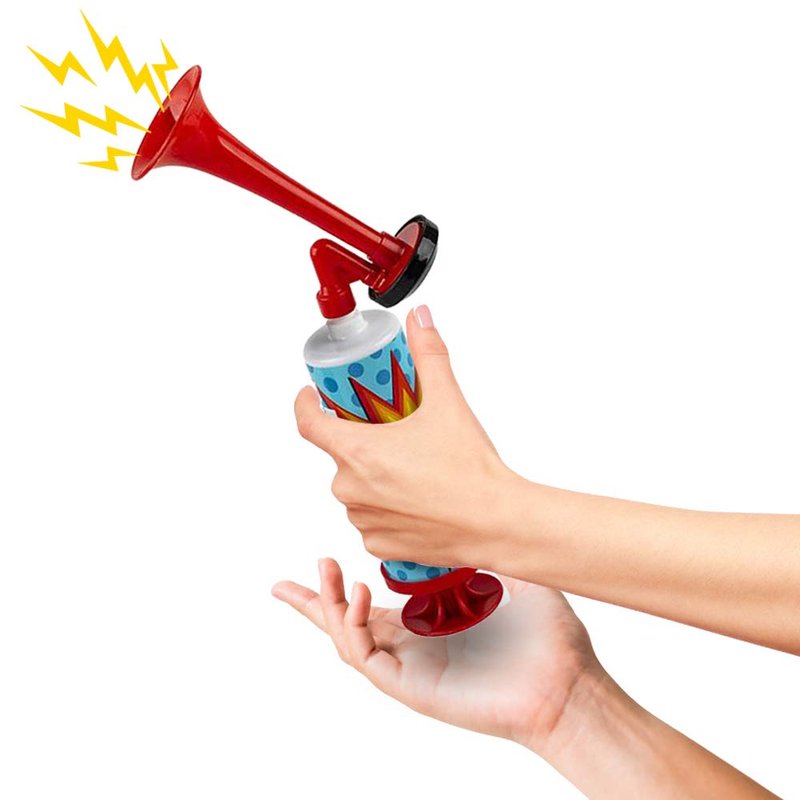 - EYE-CATCHING DESIGN: Inspired by comic books and all things cool, these pump air horn noise makers will have kids thrilled at first glimpse. We’ve given the horn a touch of bright red and decorated the pump with cool graphics to lend eye-catching aesthetics to the celebrations.