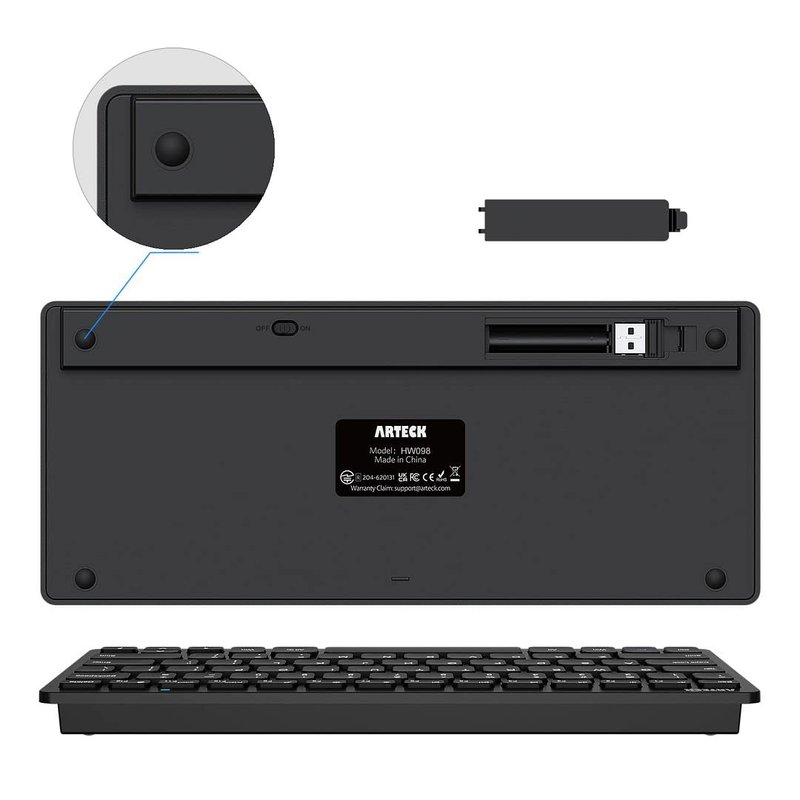 - Package contents: Arteck HW098 USB Wireless Keyboard, nano USB receiver, 2 X AAA batteries, welcome guide, our 24-month warranty and friendly customer service.