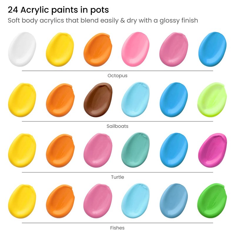 - Colorful Ocean Adventure: Painting the creatures of the deep has never been this fun! Our painting kit includes four color reference guides to help your kid to get just the right shade. Each painting canvas has its own paint set, brush, and mixing tray so multiple children can paint together.
