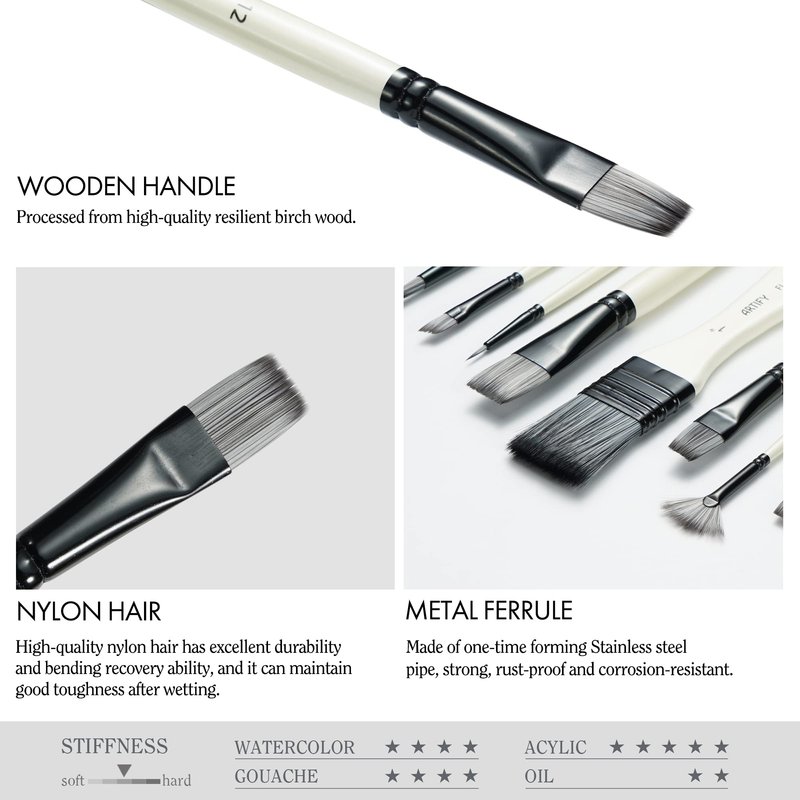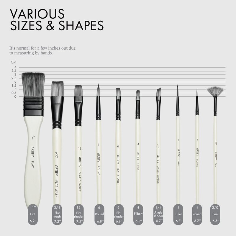 - SELECTED COLLECTION OF SHAPES AND SIZES - To bring up fresh inspiration, ARTIFY has selected 10 different shapes and sizes brushes as a set. They are liner, flat, filbert, round, fan, and angular. The paintbrush set could satisfy you whatever detailed painting or largest coat applications, every stroke will come to life.