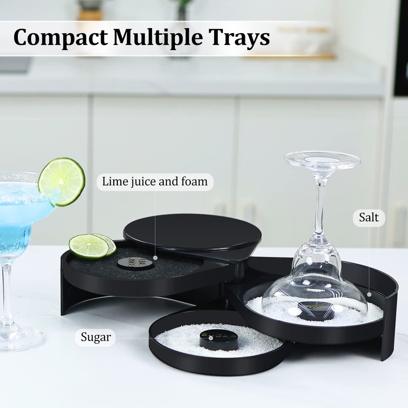 - 【All in One】Salt,sugar and lime juice trays are all in one,with one tray for moisturizing the glass rim and one for edging the glass with salt/sugar,really easy and stores nicely.