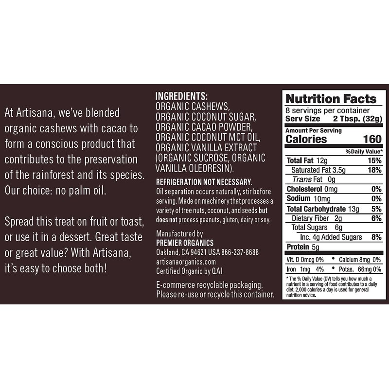 Artisana Organics Cashew Cacao Spread, 9.5oz | Sweetened with Coconut Sugar, No Palm Oil