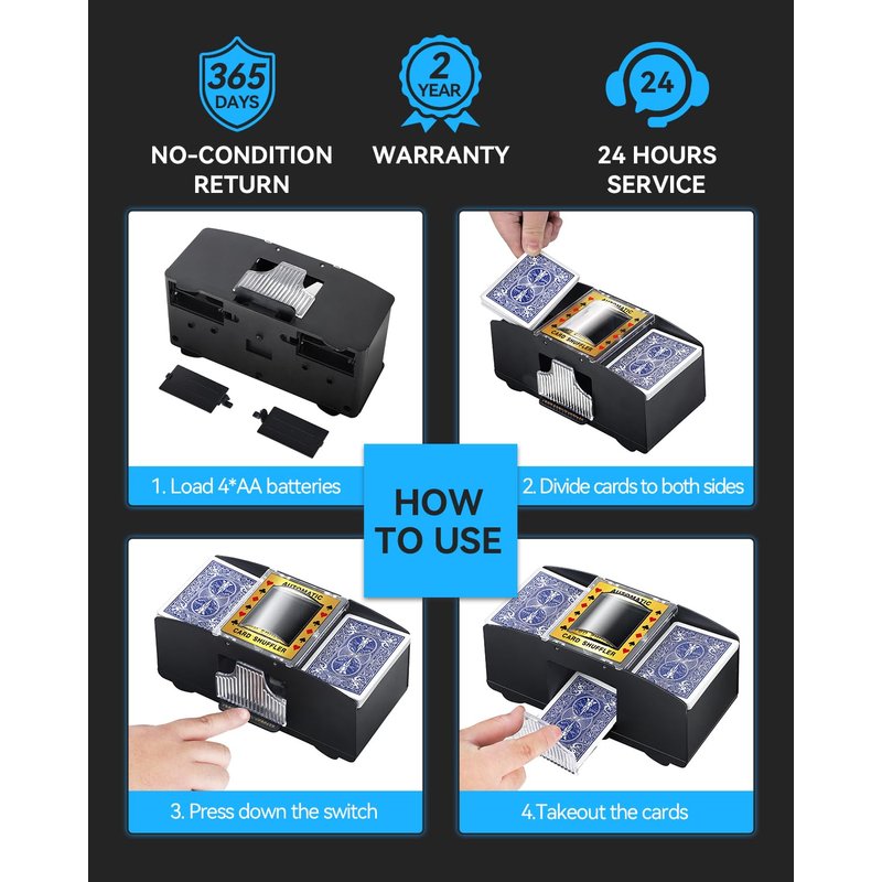 - 【SPEEDY & GENTLE】The card mixer shuffler is gentler and faster to the cards than the hand shuffler. It only takes 2.4 seconds to shuffle a deck. Keep the cards clean, tidy, and durable.