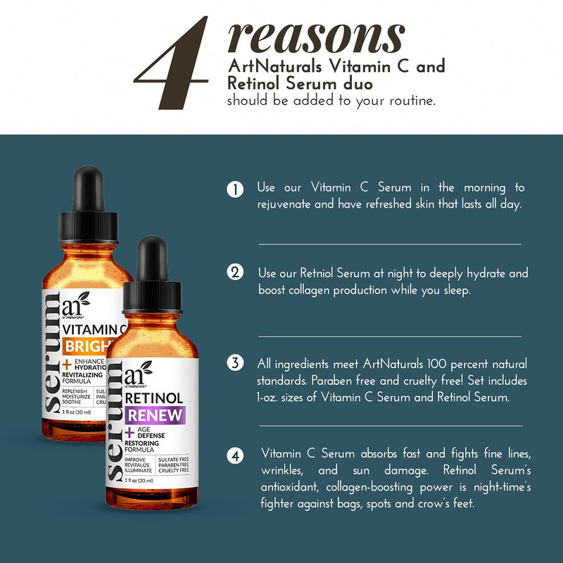 - Set includes 1-oz. sizes of ArtNaturals Vitamin C Serum and Retinol Serum.