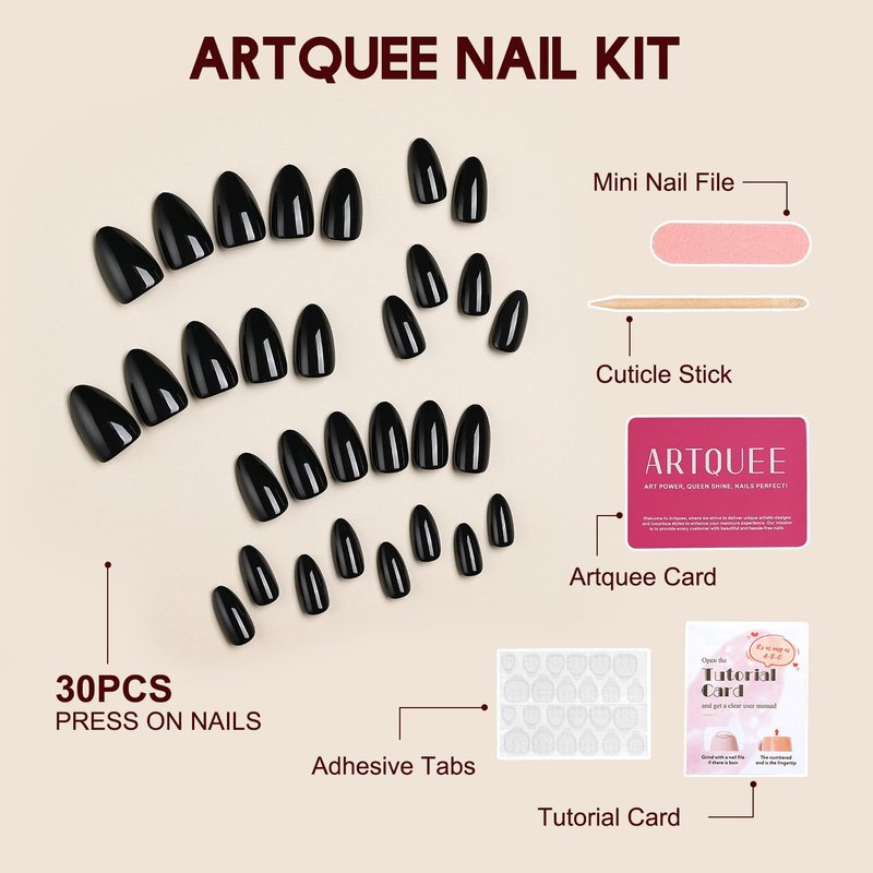 Artquee Almond Press on Nails Short Solid Color Black Fake Nails Acrylic False Nails Art Glossy Artificial Reusable Stick on Nails in 15 Sizes - 30 Nail Kit