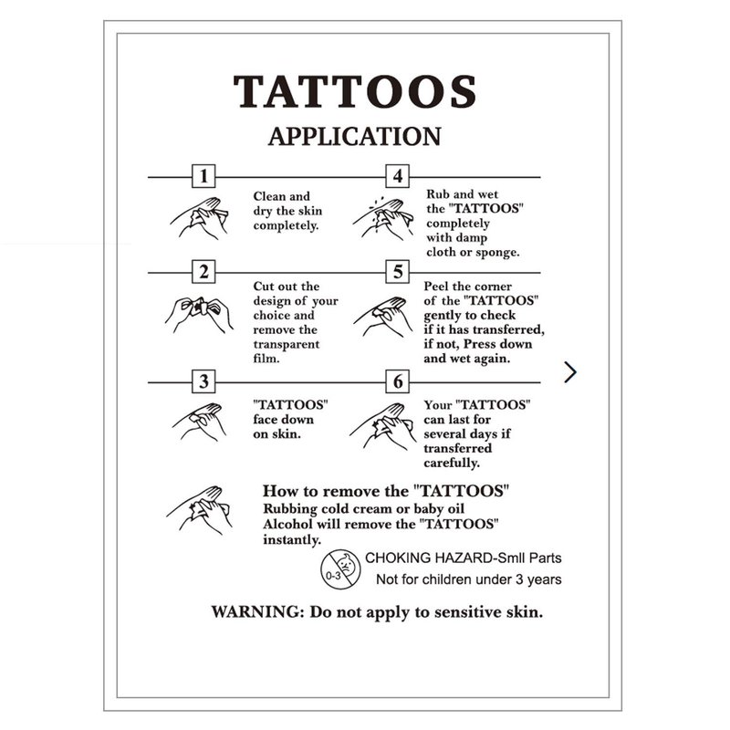 Thank you for choosing our temporary tattoos for our adult men women. We could provide you with all kinds of temporary tattoos. And we will update new items frequently, there will always be patterns you like. You can also contact us to tell us which pattern you like, and we will produce it for you.Features:Fashionable, realistic, waterproof and long lasting.Package:Includes 6 high-quality temporary tattoo stickers.Size:9.5x9.5cm3.7 X 3.7Instructions:1. Clean the skin.2. Remove the transparent protective film, put the paper side down and stick it to the skin.3. Wet the tattoo paper completely, and then wait for 20-30 seconds.4. Remove the paper and let the tattoo dry. Your tattoo is complete.If done in the correct way, temporary tattoos can be kept for 3-5 days or longer.Remove:Use a small amount of alcohol on the tattoo, wait for about 10 seconds, and then gently wipe with more alcohol until it is removed.