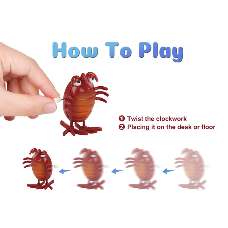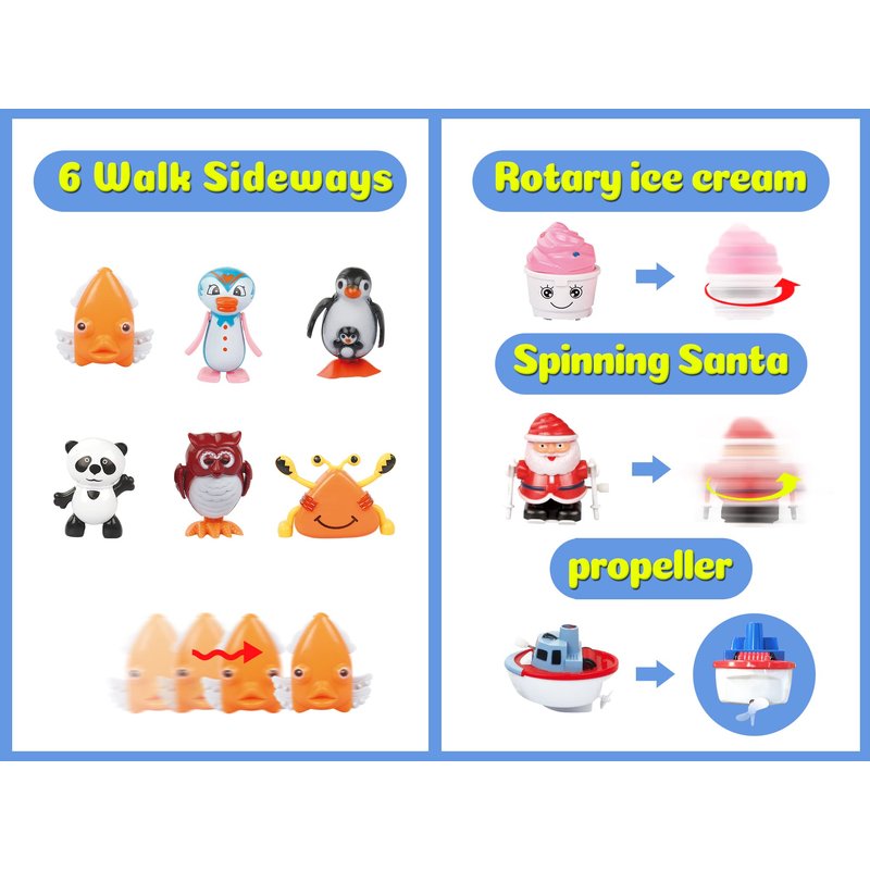 - Super Fun: Simply prime the clockwork mechanism, then each wind-up toy does a different trick such as Swimming in water, Flipping, Sliding, Spinning, Walking, Shaking head or tail and else.