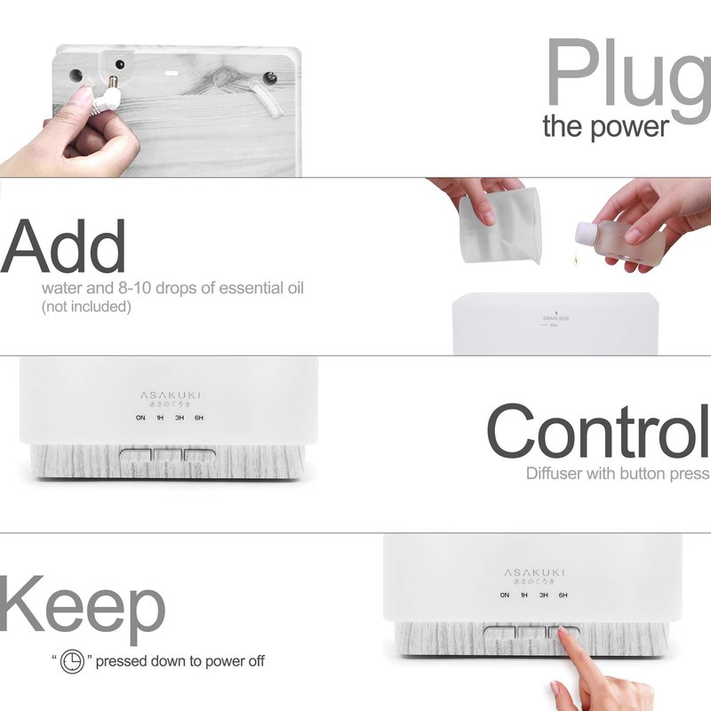 - [100% Risk Free Purchase] At ASAKUKI, we have great faith in our essential oil diffusers. After all, we use them in our homes ourselves! Each one of them comes with a 1-year technical support. If you have any issue with your diffuser, do not hesitate to contact us - your satisfaction is paramount!