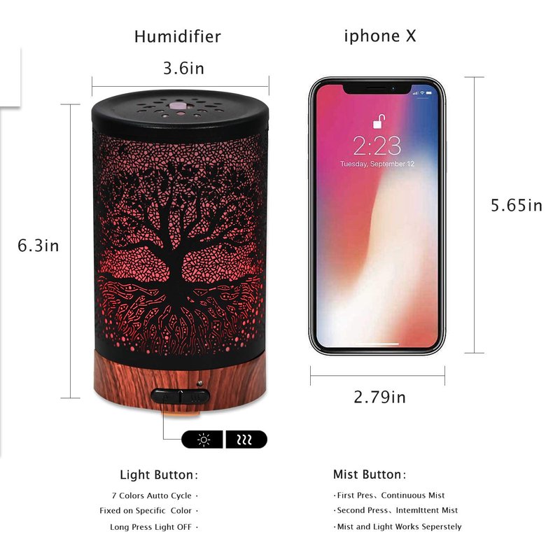 - 【7 Color Led Lights & 2 Mist Modes】The ultrasonic oil diffuser has 7 color led lights, each color has bright and dim, or turn off all lights for total darkness.You can adjust the mist with 2 modes. Intermittent mist (30 seconds on/30 seconds off), continuous mist. Working time: 3-4 hours in continuous mode, 6-8 hours in intermittent mode.You can choose your prefered color and mist mode to meet your different needs.