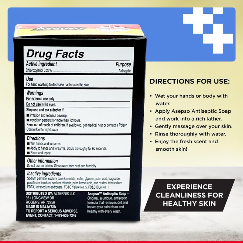 - HYDRATING AND NOURISHING: Enriched with premium ingredients, Asepso Antiseptic Soap ensures your skin stays hydrated and smooth. This nourishing formula helps prevent dryness, leaving your skin irresistibly soft and refreshed, making it an essential part of your daily skincare regimen.