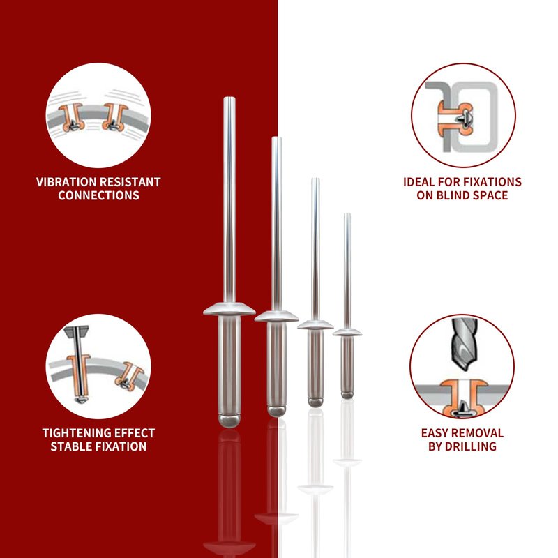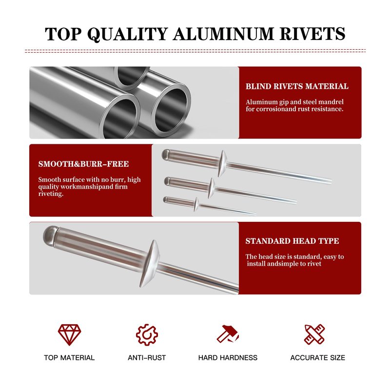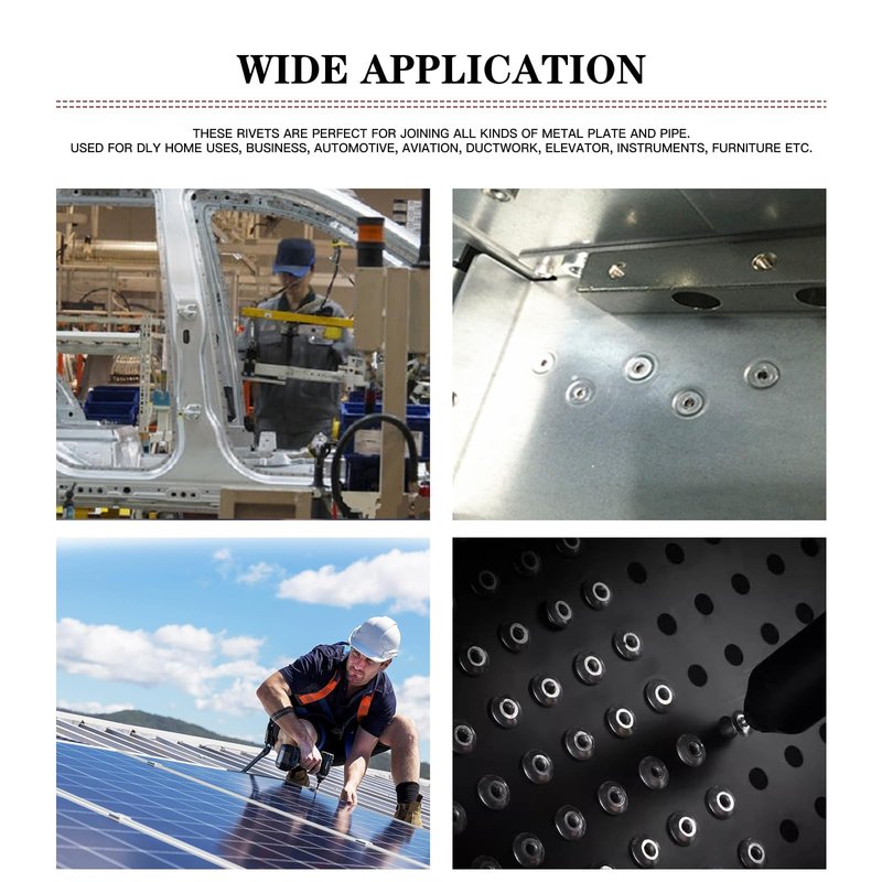 - (material)Our popular rivets are made of high-quality aluminum and steel, which have excellent corrosion and acid resistance, so you don't have to worry about rusting or breaking. Excellent performance in any environment.