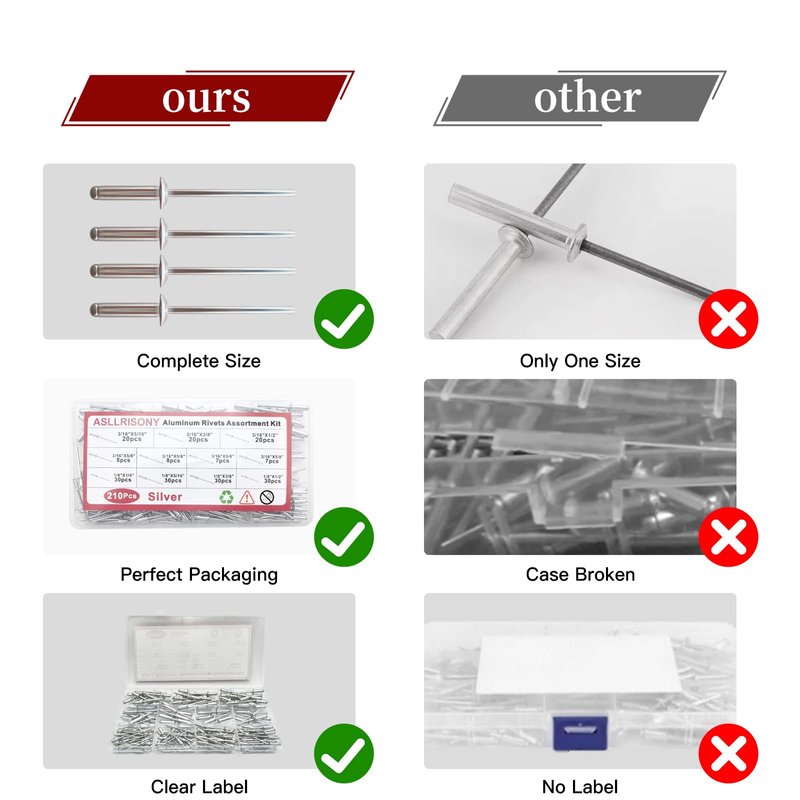 - (package)Our popular rivet classification kit comes with a packaging box, so you can quickly find the size you need through the label. Each box is treated with heat shrink film to ensure it is brand new and prevent air oxidation when it reaches the hand