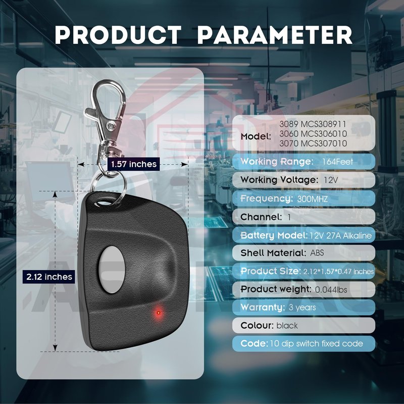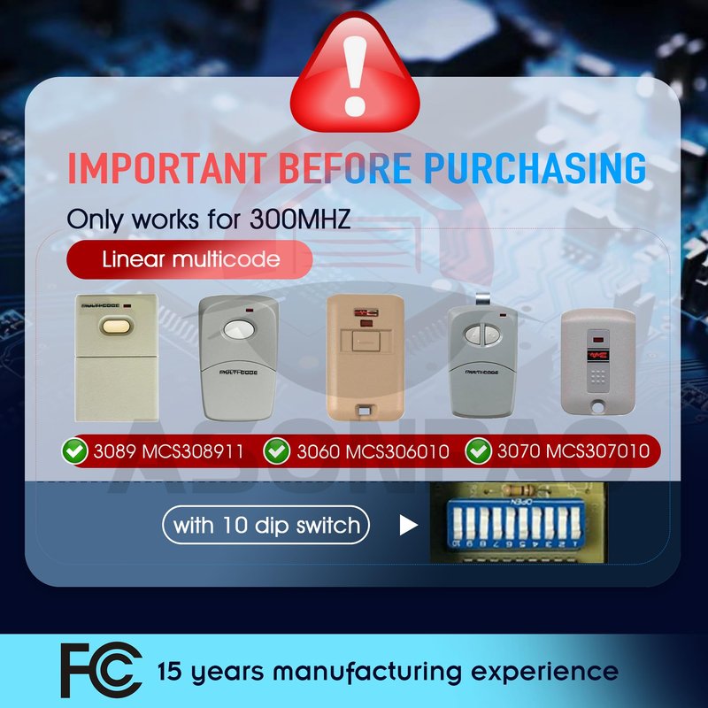 - **Compatible list**: Compatible with 300MHZ Multicode 3089 MCS308911,3060 MCS306010,3070 MCS307010 Remote 10 Dip Switch.