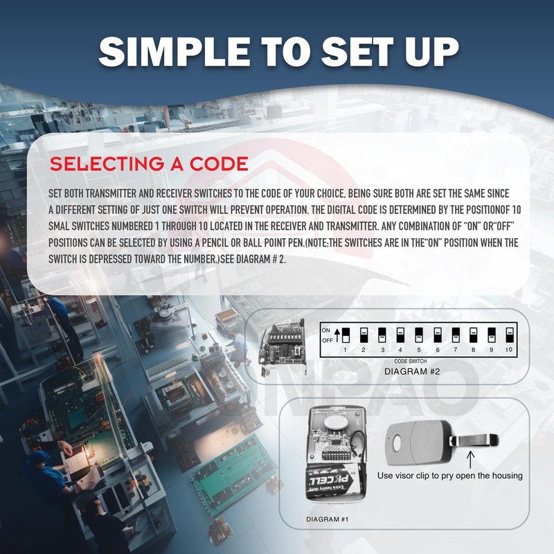 **Compatible list**: Compatible with 300MHZ Multicode 3089 MCS308911,3060 MCS306010,3070 MCS307010 Remote 10 Dip Switch.