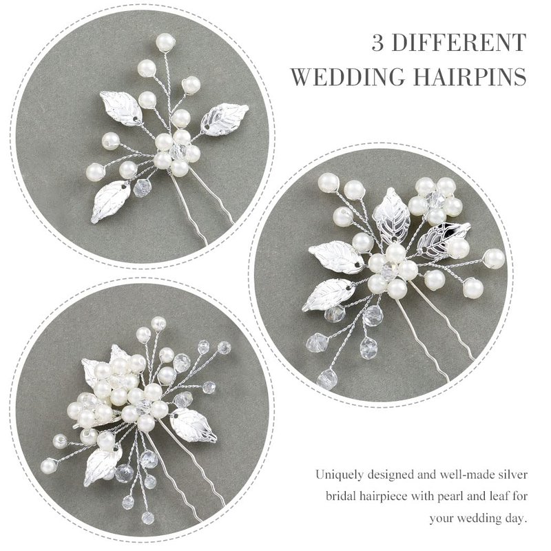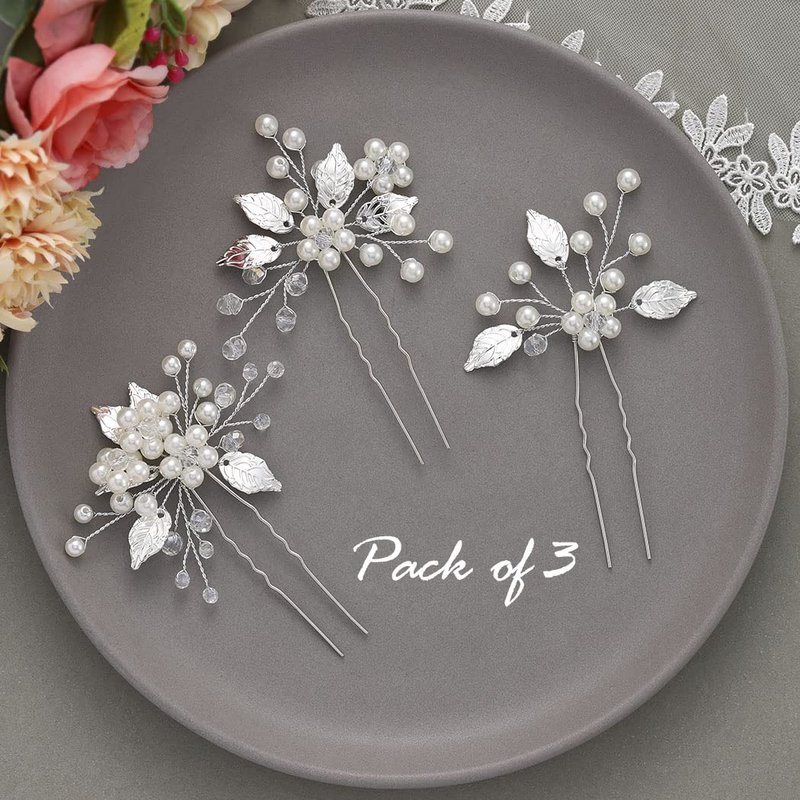 Asooll Pearl Bride Wedding Hair Pins Leaf Bridal Hair Pieces Hair Accessories for Women and Girls (Pack of 3) (Silver)