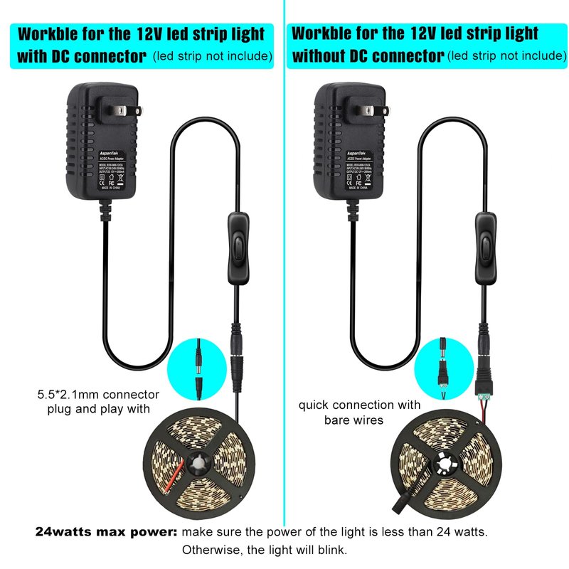 - Max Power 24watt: Our DC power supply is mainly designed for small DC 12V LED lighting products that draw any amount of power up to 24 watts; Make sure the power of your light is no more than 24 watts. Otherwise, the LED light will blink or dim since the power supply can not offer enough power for the light