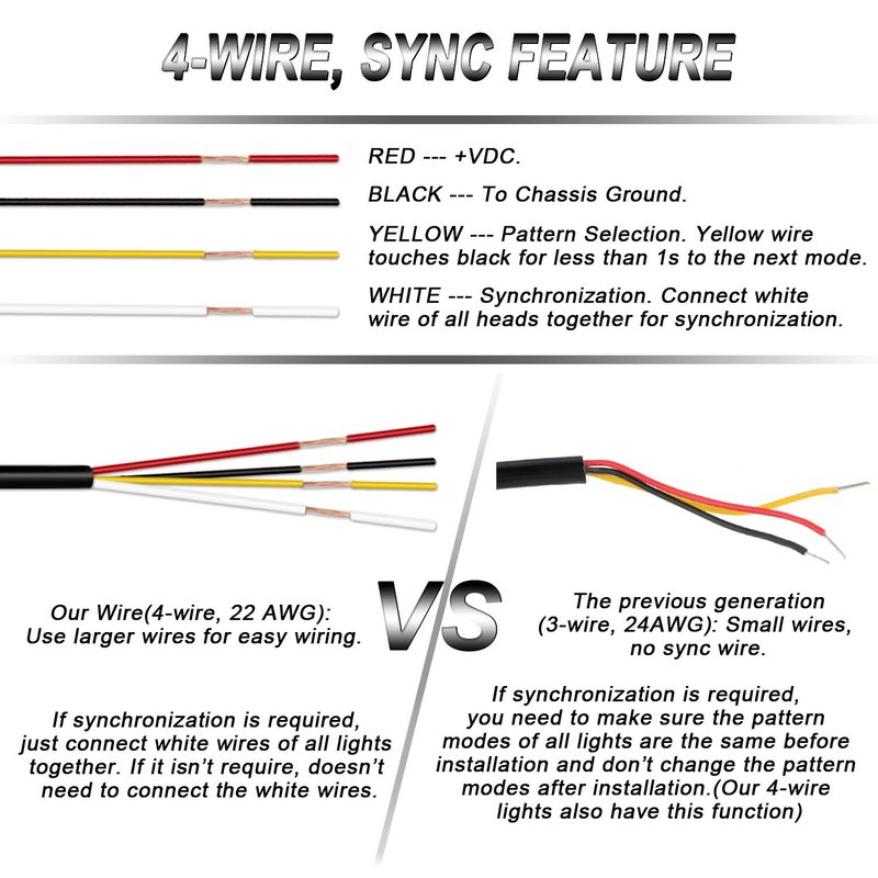 - 【ADDED AYNC WIRE】Upgraded the synchronization function. If sync is required, just connect white wires of all lights together. RED --- +VDC. BLACK --- To Chassis Ground. YELLOW --- Pattern Selection. Yellow wire touches black for less than 1s to the next mode.