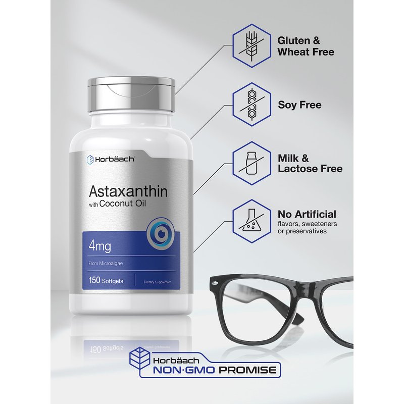 Astaxanthin 4mg | 150 Softgels | with Coconut Oil | Supplement from Microalgae | Non-GMO, Gluten Free | by Horbaach