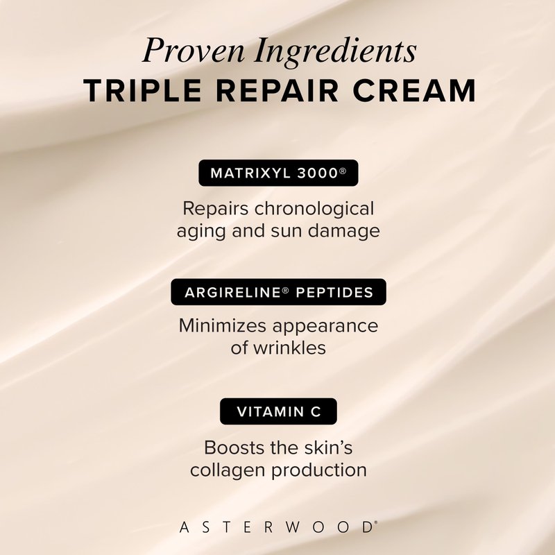- Your Night-Time Moisturizer: Indulge in our Triple Repair moisturizing cream to renew the look of tired skin overnight. This powerful trio of Matrixyl 3000, Argireline, & Vitamin C locks in moisture and stimulates collagen production.
