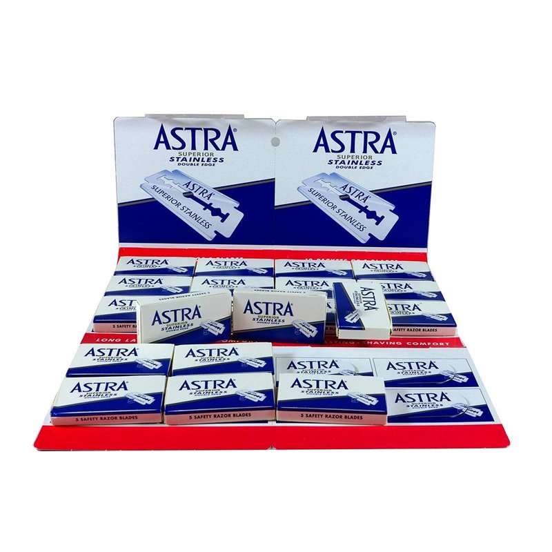 Astra blades are noted for sharpness, durability and comfort. Manufactured in Russia, for Gillette these blades are outstanding in all standard double edge safety razors. These are an excellent blade and value. Packaging is also environmentally friendly - they come packed in paper boxes versus plastic. Contains 100 blades - 20 tucks of 5 blades on a cardboard display card.