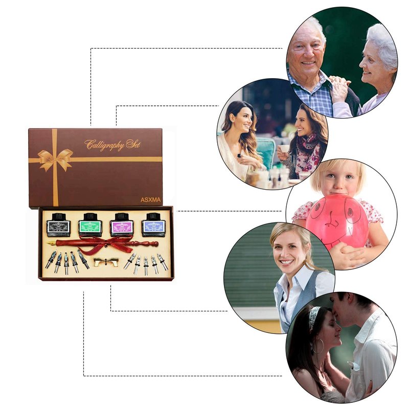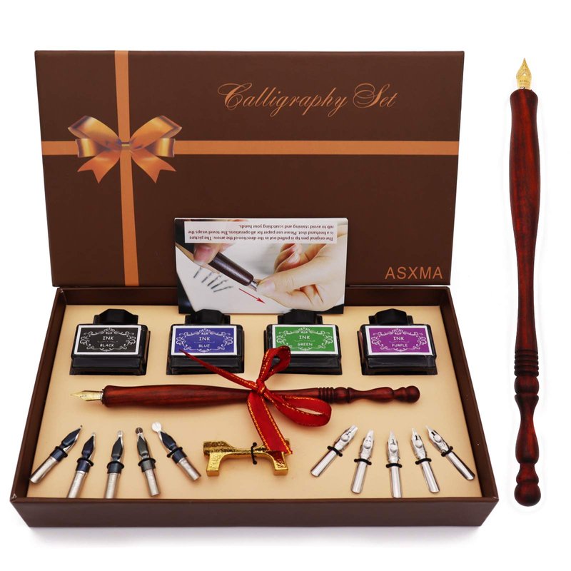 ASXMA Calligraphy Pen Set – Includes Wooden Dip Pen, Antique Brass Holder, 11 Nibs, 4 Colors Ink Bottles and Beginner's Manual-for Beginners and Calligraphy Lovers