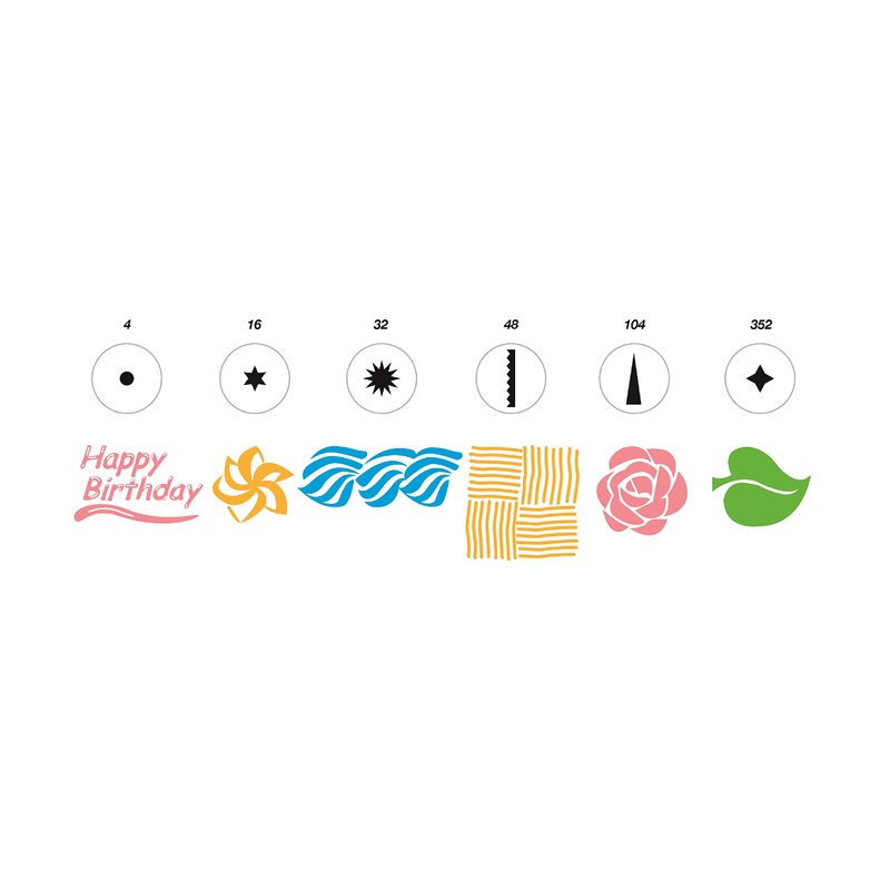 - Stainless steel tips included: 4, 16, 32, 48, 104, 352 - to make roses, shells, leaves, stars, scrolls and lettering
