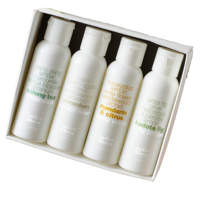 Take your favorite bath and body products on the go, or give the gift of beautiful skin and hair with the exclusive Atelier Bloem Travel Gift Set. Perfectly sized for your travel bag, guest bathroom, or shower, this irresistible set includes 1.7-ounce bottles of Atelier Bloem Oolong Tea Shampoo, Geranium Conditioner, Mandarin & Citrus Body Wash, and Kadota Fig Body Wash. Formulated with hair-strengthening ingredients like geranium, oolong tea, cardamom, neroli, and sandalwood, our shampoo and conditioner give you the healthy, shiny hair of your dreams. Our shower gel and moisturizer help nourish your skin with kadota fig, citrus, eucalyptus, and more. Designed exclusively for Kimpton Hotels, Atelier Bloem products are paraben-free, cruelty-free, and made without animal testing.