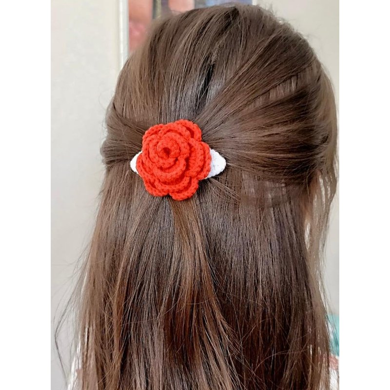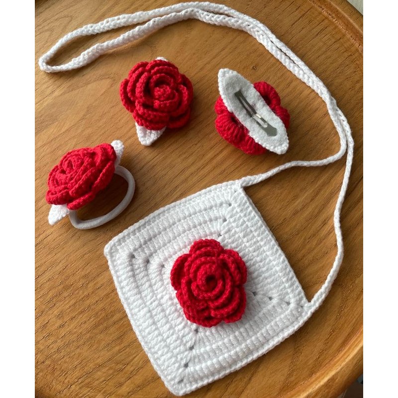 Atelier PG Set of 4 Crochet Hair Pins, Rubber Buckle & Mini Bag, Handmade Accessories for Girls (Red Rose)