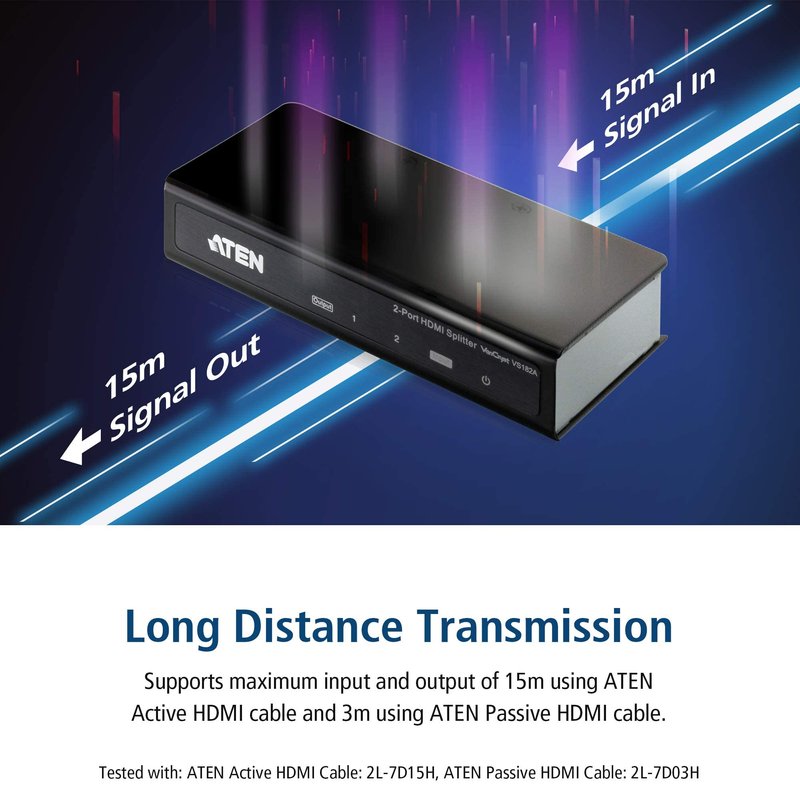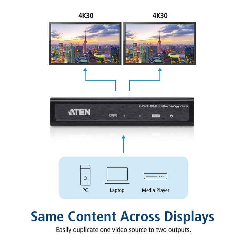 ATEN VS182A HDMI Splitter 2 Out 2-Port 4K 1 in Connect PC Camera DVD Media Player in Up to 2 HDMI Displays Projector Monitor TV Out - Up to 4096 x 2160/3840 x 2160 60Hz - Metal