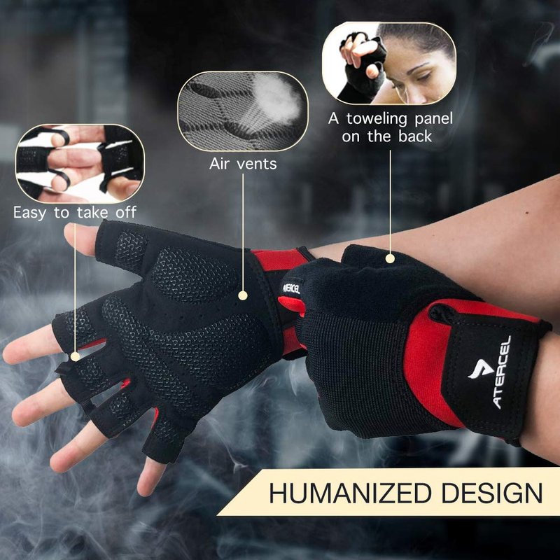 - Humanized Design: Atercel workout gloves are designed with a pull loop system for easy removal. A towelling panel on the back of the glove for wiping away sweat, and the soft mesh fabric inside fit the front of hand to keep your palm cool and dry all workout long.