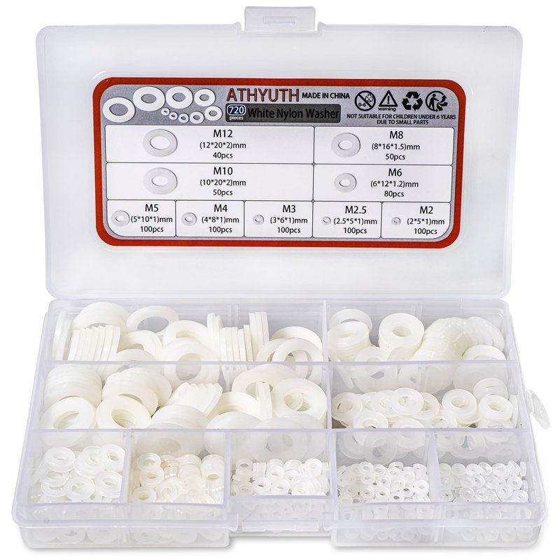 ATHYUTH White Nylon Washers is made of nylon material, which is characterized by abrasion resistance, corrosion resistance, high temperature resistance, etc. It is widely used in mechanical equipment, automotive industry, construction engineering and other fields. it protects the surface of the connected part from abrasion by the nut and distributes the pressure of the nut on the connected part. Type: Flat Washers Material: Nylon Color: White Quantity: 720pieces Package Included: M2:(2*5*1)mm-100pcs M2.5:(2.5*5*1)mm-100pcs M3:(3*6*1)mm-100pcs M4:(4*8*1)mm-100pcs M5:(5*10*1)mm-100pcs M6:(6*12*1.2)mm-80pcs M8:(8*16*1.5)mm-50pcs M10:(10*20*2)mm-50pcs M12:(12*20*2)mm-40pcs Transparent Storage Box:1pcs